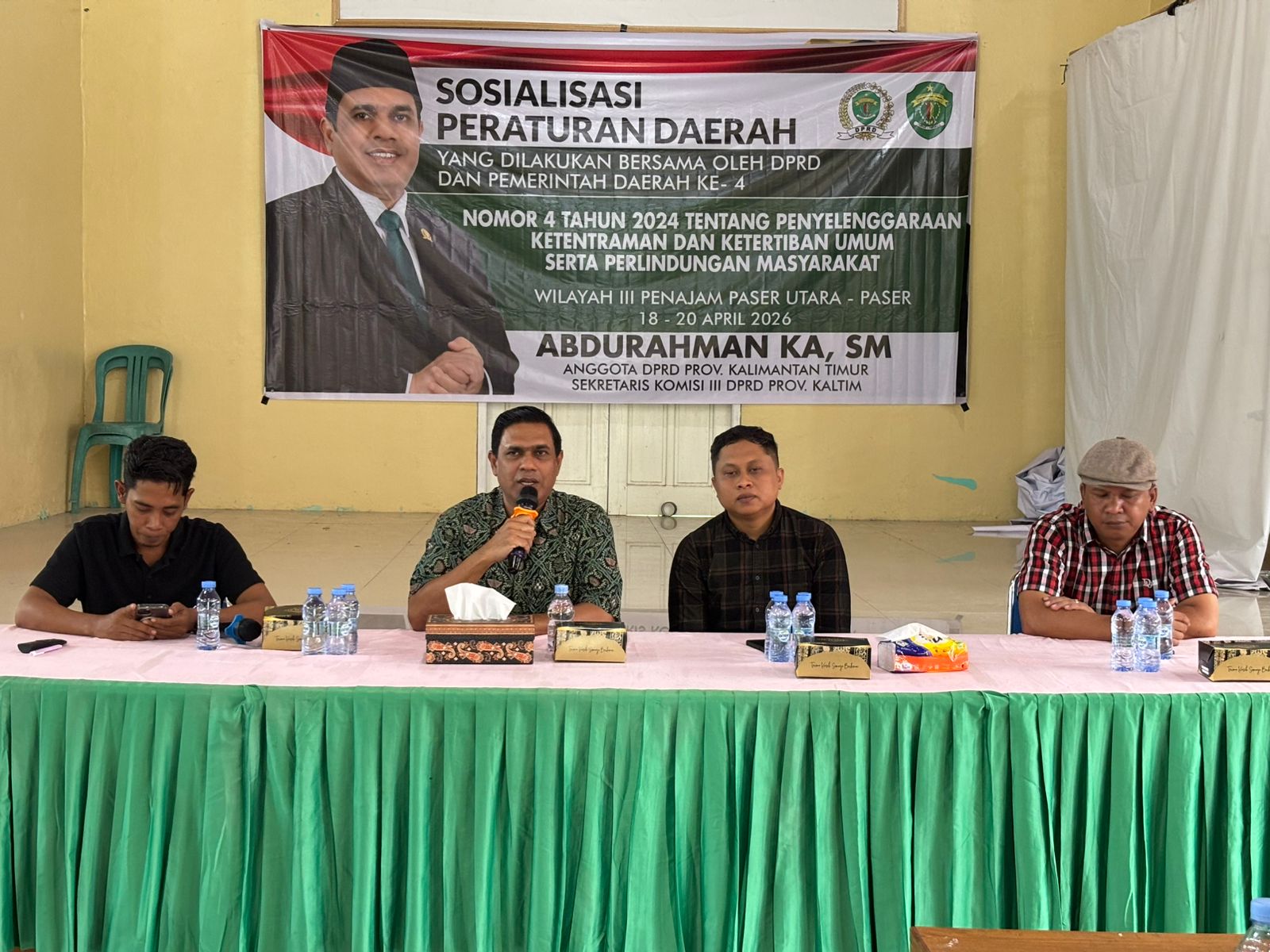 MEDIAKATA.COM, KAB. PASER – Anggota DPRD Kalimantan Timur (Kaltim), Abdurahman KA, SM kembali melakukan agenda Sosialisasi Perda (Peraturan Daerah) Kaltim. Kali ini Dia menyosialisasikan Perda Nomor 4 Tahun 2024. Tentang Penyelenggaraan Ketenteraman dan Ketertiban Umum, serta Pelindungan Masyarakat, kepada warga Kabupaten Paser.